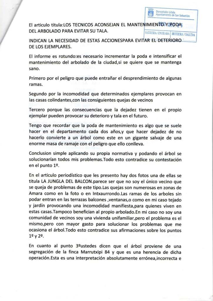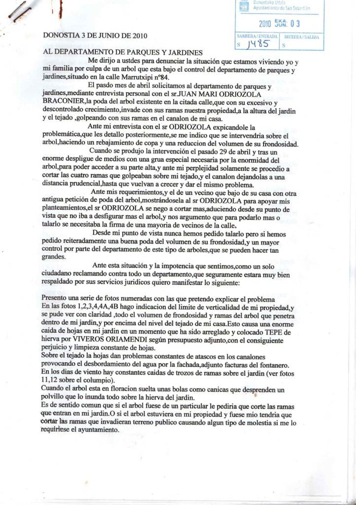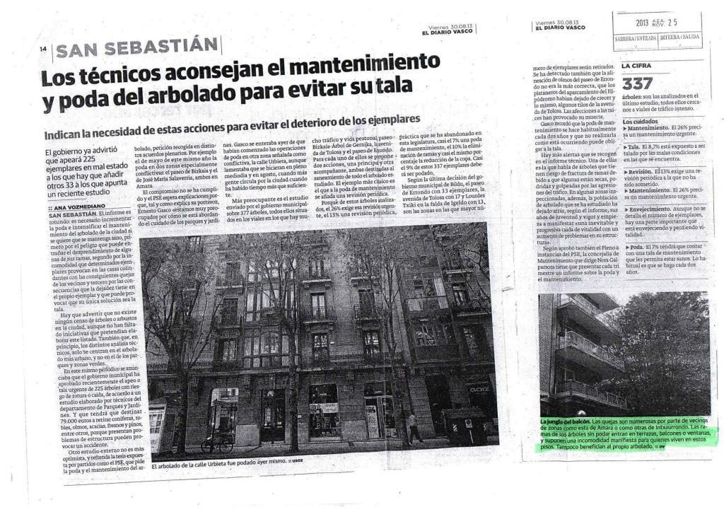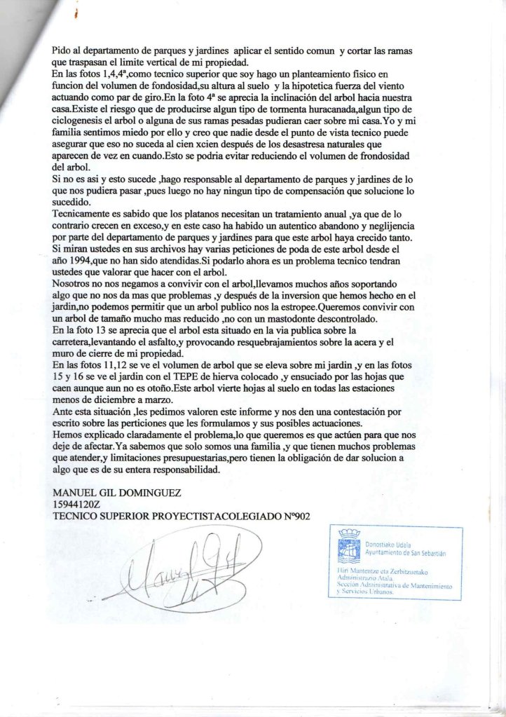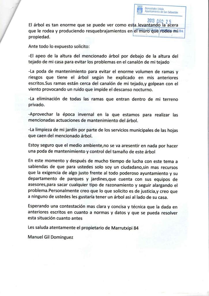 Esta situación es ya un problema asumido por todo el vecindario, próximamente comenzaremos una recogida de firmas en todo el barrio, para que sea podado sin mayores dilaciones, comprometiéndose por escrito los responsables para que de forma periódica tengamos el mismo derecho que otros ciudadanos donostiarras que tienen igualmente arbolado cercano a sus casas.